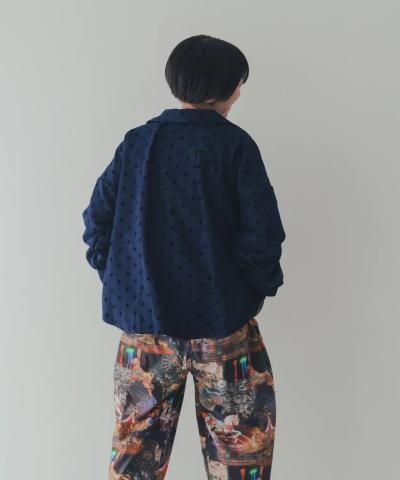 ドット柄のダンガリー生地を使ったジャケットはデニムのような硬さがなく、楽に羽織れるのが嬉しいポイント。