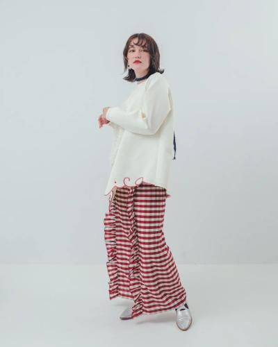 ユニークなカッティングの裾には、よく見るとブランドネームの刺繍が。