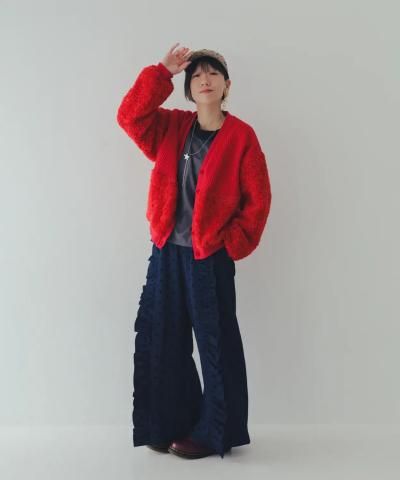 カジュアルなコーディネイトによく合うダンガリー生地を使ったパンツも、フリルをあしらうことでunicaらしくキュートにアレンジ。