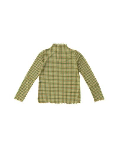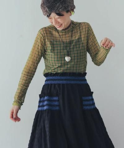 シアー感のあるチェック柄の生地を使用したカットソーは伸縮性も良く、肌への当たりも柔らか。